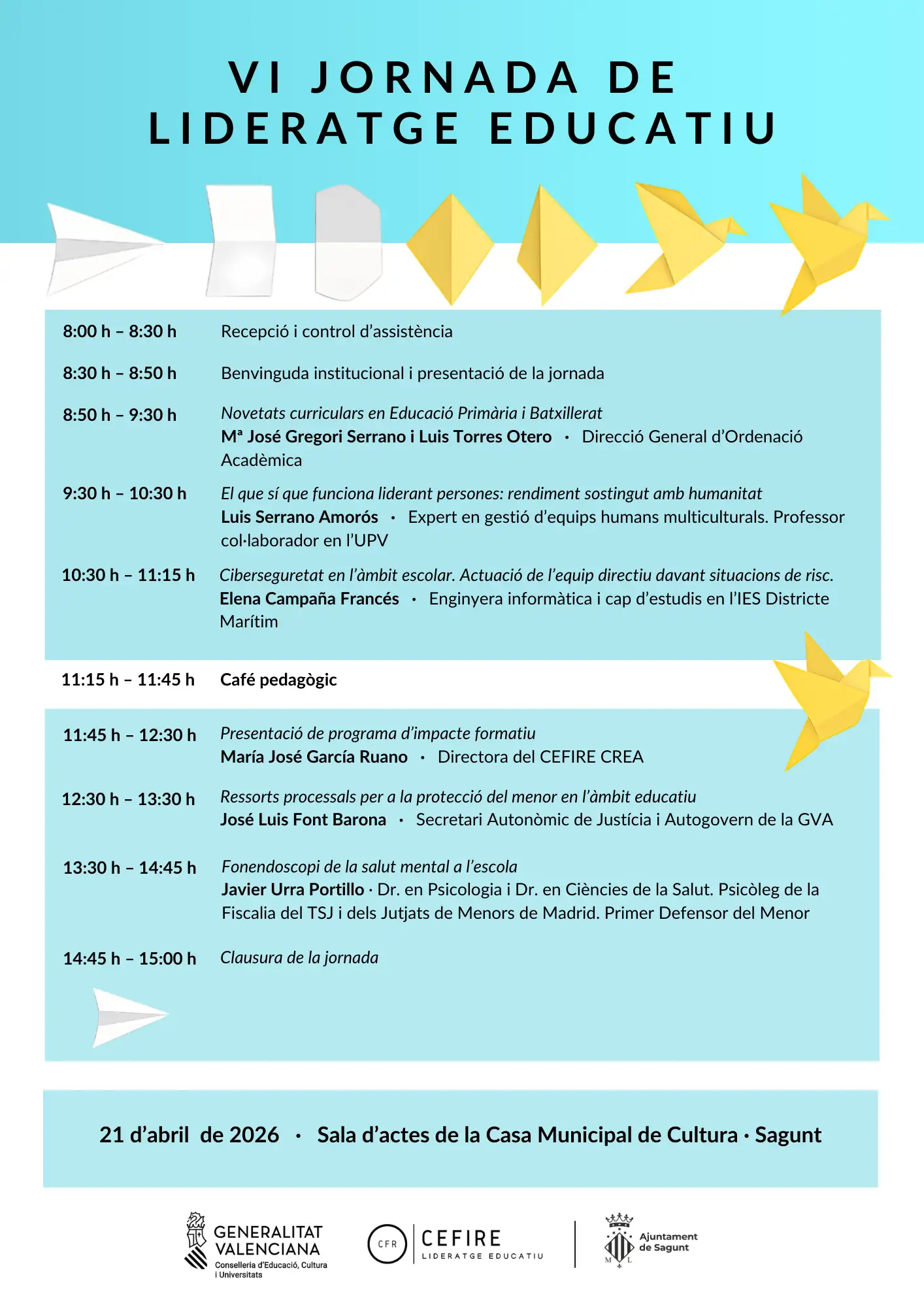 El CEFIRE de Lideratge Educatiu, en col·laboració amb l’Ajuntament de Sagunt, organitza la VI Jornada de Lideratge Educatiu, una trobada imprescindible per a totes aquelles persones que desitgen impulsar un lideratge transformador als centres educatius.