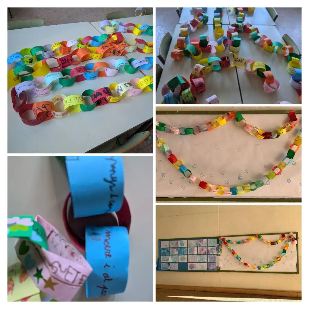 A lo largo de las semanas anteriores, en cada clase, desde 2 años hasta 6.º han estado preparando una «cadena de favores» donde el alumnado ponía en cada eslabón un favor o ayuda que podía hacer a sus compañeros y compañeras. Así, «ayudar cuando alguien no entiende algo», «integrar a un compañero/a en los juegos»,ayudar a tener la clase limpia»,etc han ido formando cada cadena de clase, que después formaran cadenas más largas para decorar nuestro centro y recordar cuan importante es tener y hacer la PAZ.