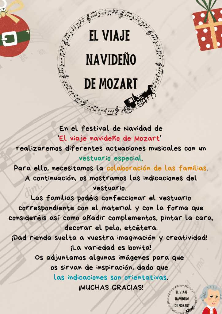 El miércoles 18 de diciembre a las 10 horas celebraremos nuestro Festival de Navidad en el Teatro Principal de Requena. Todas las familias estáis invitadas a este evento musical que se llamará: EL VIAJE NAVIDEÑO DE MOZART.
