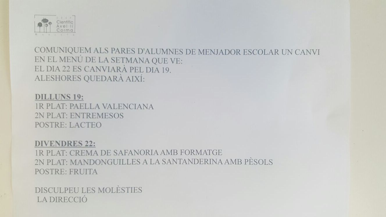 Avís Menjador Escolar