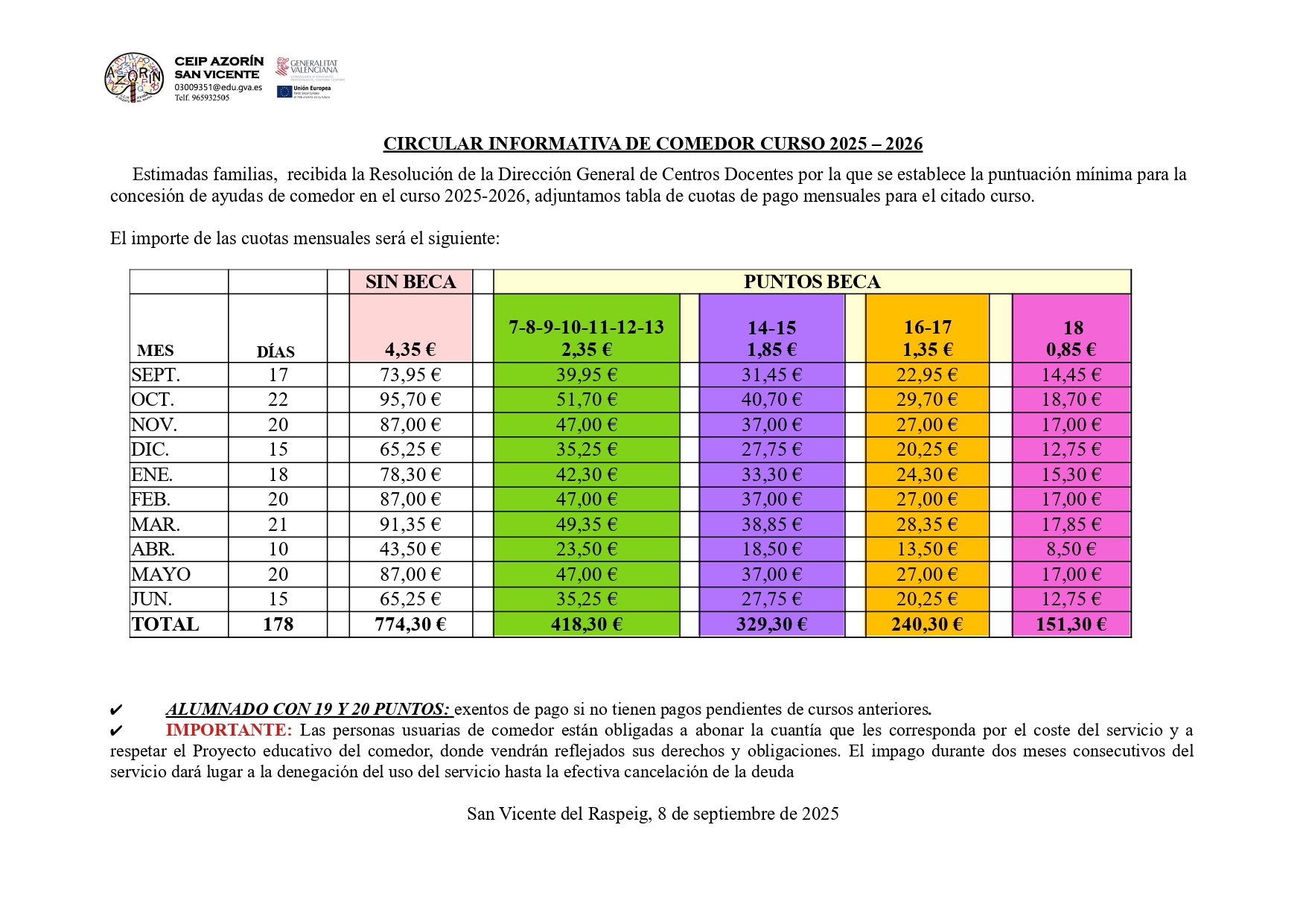 IMPORTE DE LA CUOTAS MENSUALES TENIENDO EN CUENTA LA PUNTUACIÓN OBTENIDA EN LA BECA.