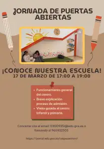 El próximo 17 de marzo de 17.00 a 19.00 tendremos en el centro la jornada de puertas abiertas en la que podréis visitar las instalaciones y conocernos un poco más.