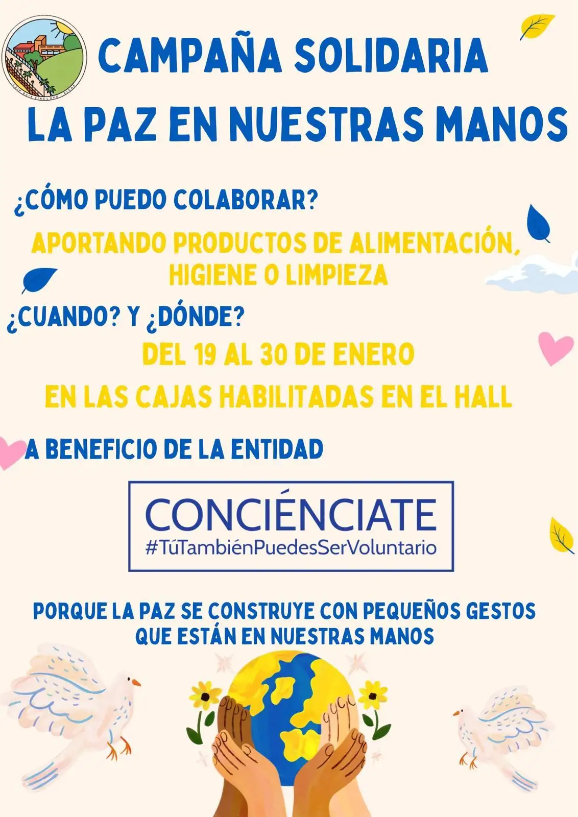 Con motivo del Día de la Paz, nuestro centro pone en marcha una campaña solidaria que se desarrollará del 19 al 30 de enero, con el objetivo de recordar que la paz se construye día a día a través de pequeños gestos cotidianos que están al alcance de todos y todas.