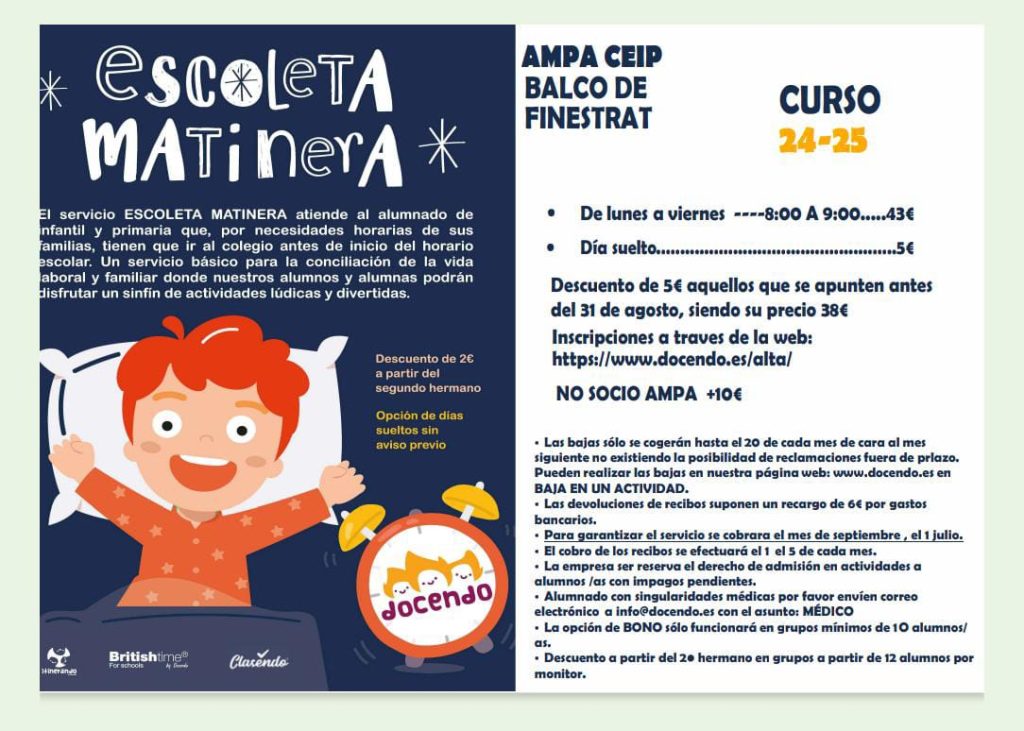 Des de l’empresa de l’escoleta “Matinera” i d’activitats extraescolars (Empresa Docendo) s’oferixen les activitats i serveis de pagament. Amb la finalitat de poder donar servei de la “Matinera” es necessita un mínim d’usuaris i es gratificará amb 5 euros de descompte a aquelles famílies que s’inscriguen abans del 31 de juliol. Escola matinera de 8h a 9h.