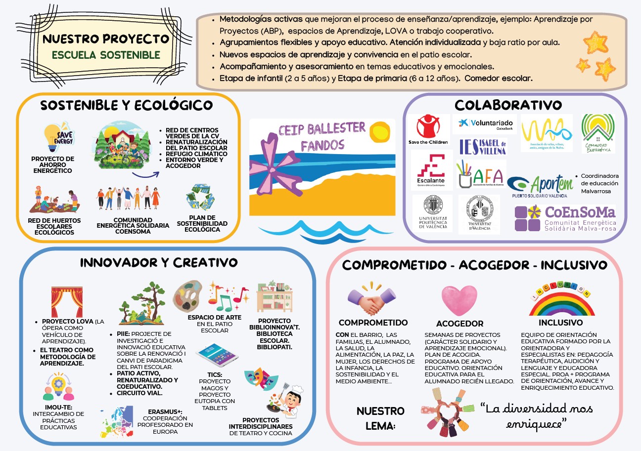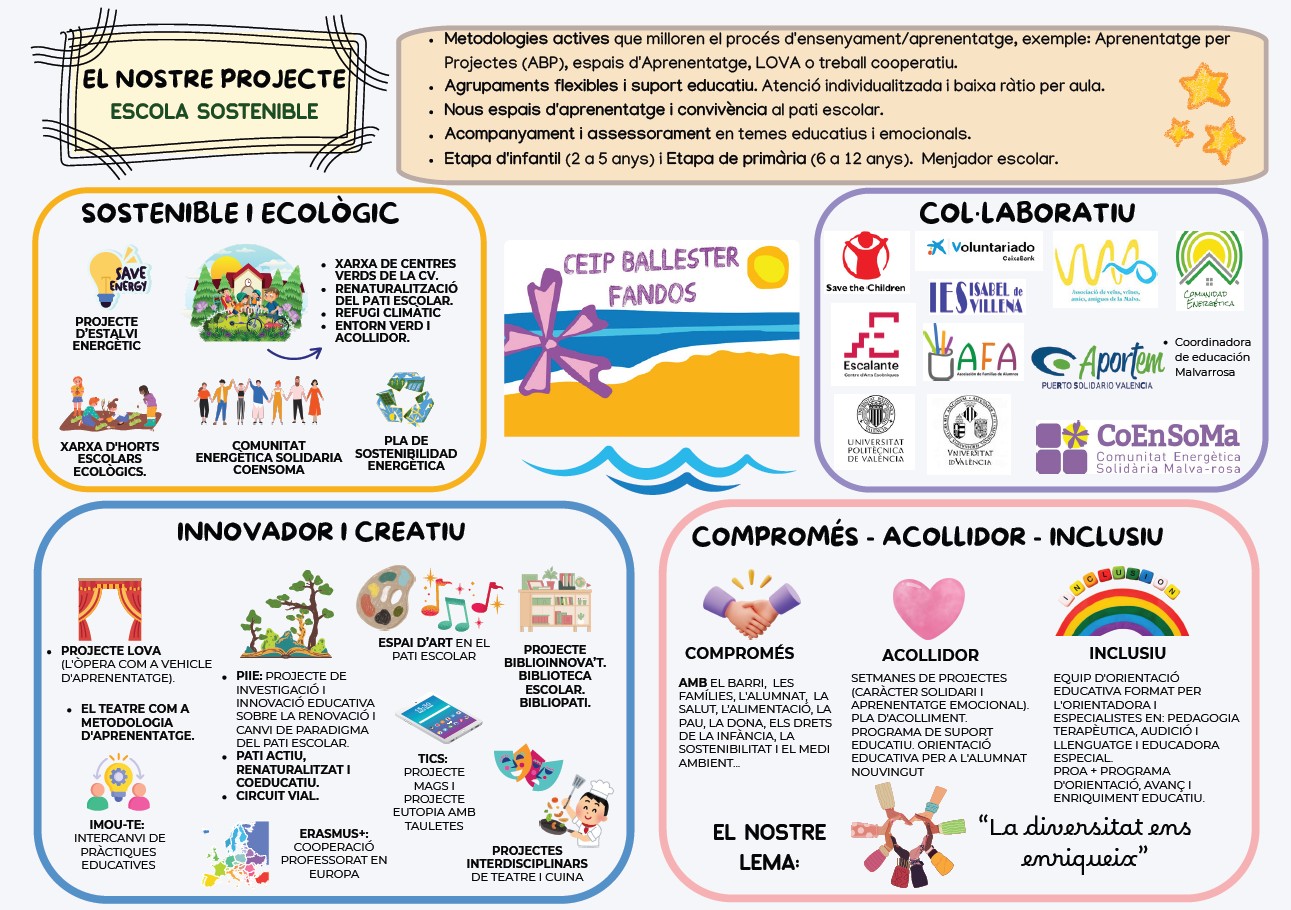 El nostre col.legi tè el seu origen a l’antic centre d’educació especial María Carbonell de l’avinguda Malva-Rosa i actual Universitat Popular de la Malva-rosa. Al 1960, les quatre mestres i la directora passaren a formar el primer Claustre del Col.legi de xiquetes Vicente Ballester Fandos. Fou anys mès tard quan tres mestres i un director començaren a donar clase als xics.