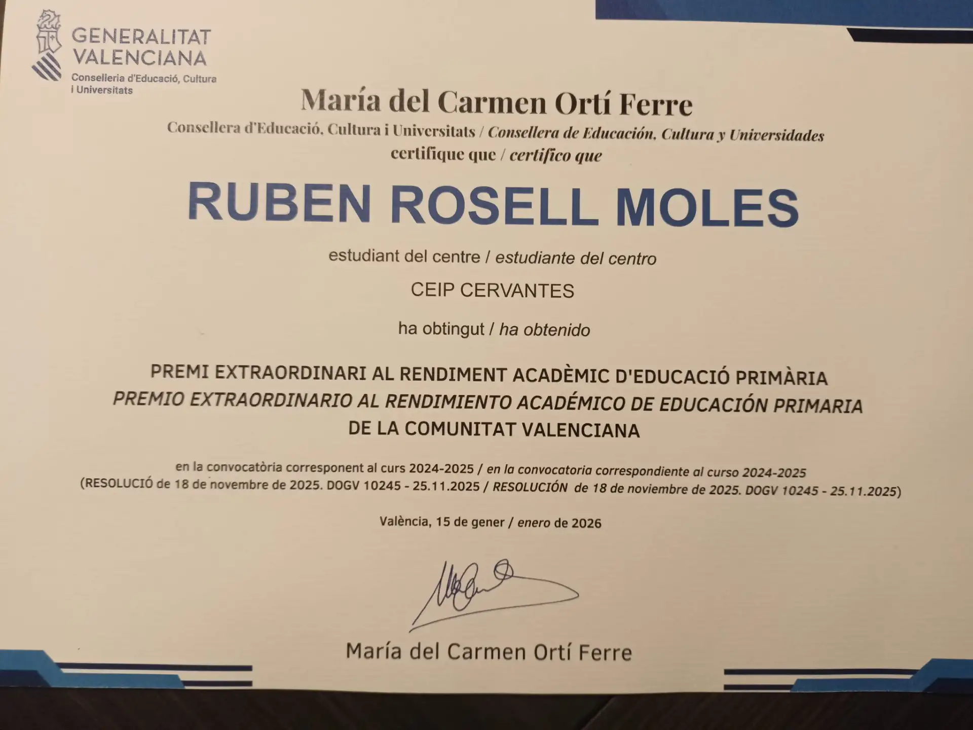 El nostre alumne Rubén Rosell Molés, actualment ja cursant estudis a l’IES Gilabert de Centelles, va rebre aquest guardó de mans de les autoritats de la Conselleria d’Educació a l’acte que es va portar a terme al Palau de Congressos.