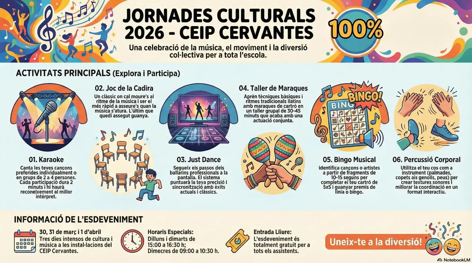 Enguany els tallers estan pensats per tal de conèixer i treballar activitats pròpies relacionades amb la música. L’alumnat, dividit en sis grups, on cada grup conté xiquets i xiquetes de totes les edats, han fet hui els seus dos primers tallers, dimarts faran dos més i dimecres els altres dos que els quedaran.