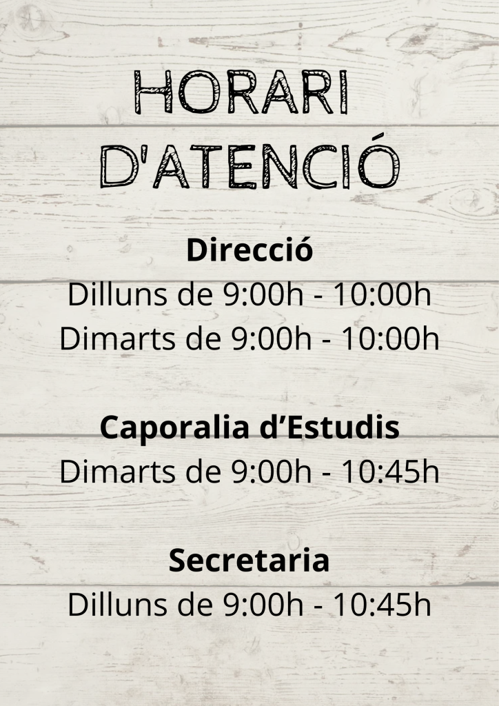 A continuació us deixem una fotografia del quadre penjat a l’entrada de l’escola amb l’horari d’atenció del centre, concretament de la direcció, la caporalia d’estudis i la secretaria del mateix.