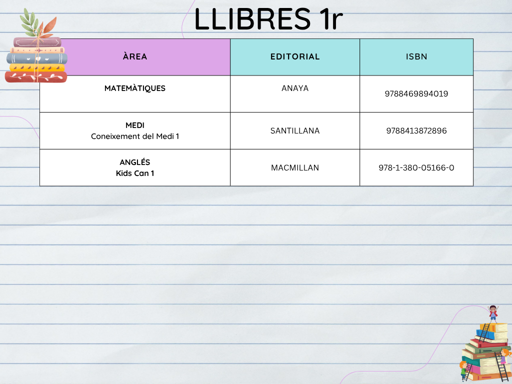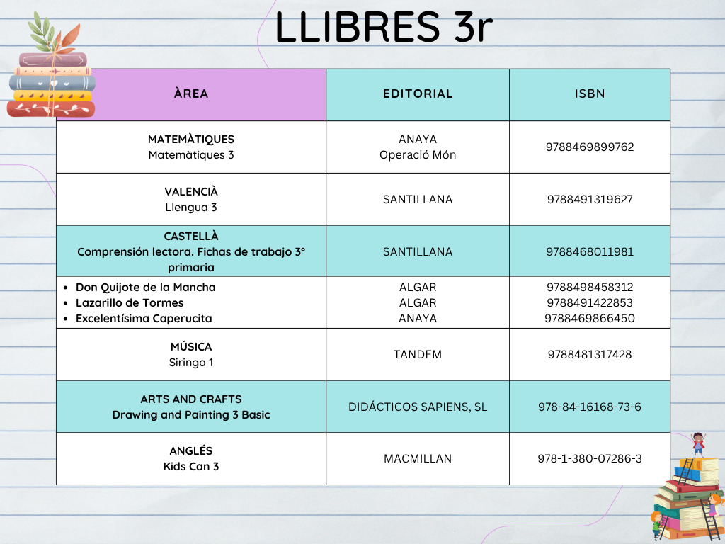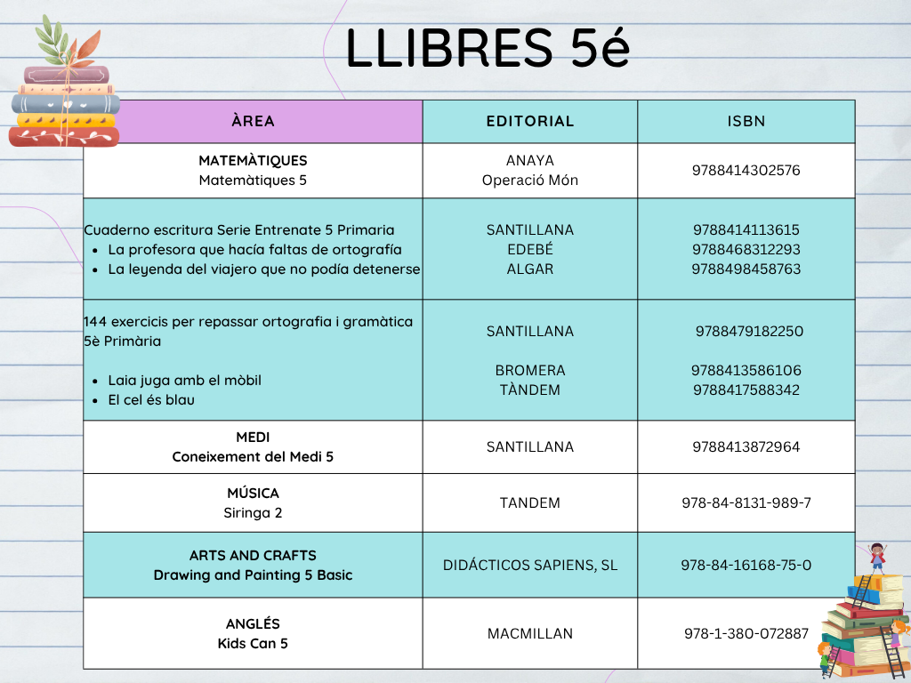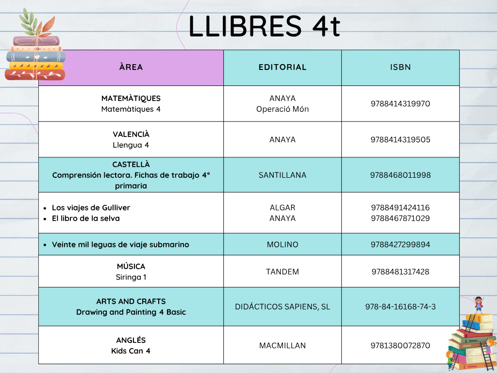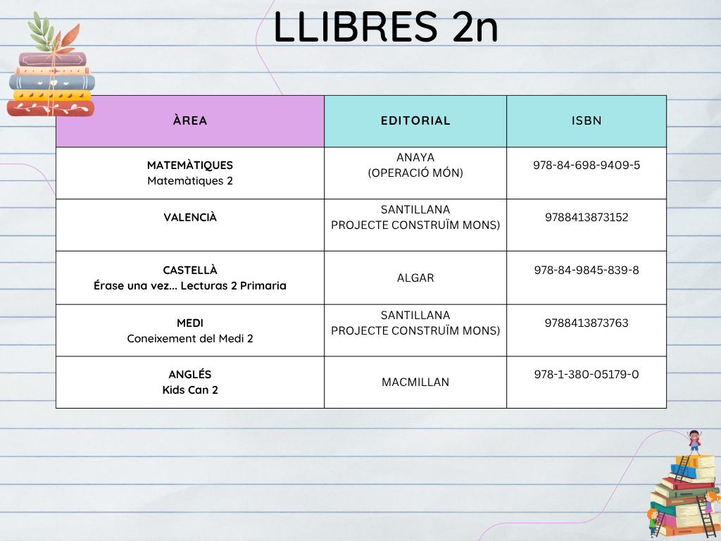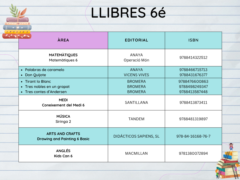 Ací teniu el llistat dels llibres de text per al pròxim curs. Recordeu que els materials que apareixen en color verd són els que les famílies haureu de comprar.