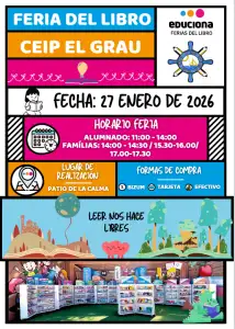 Queridas familias, Queremos informaros que el próximo martes 27 de enero organizaremos en la escuela, un curso más, una feria del libro con la colaboración de la empresa EDUCIONA. El objetivo es acercar al alumnado el gusto por la lectura y desarrollar una jornada de convivencia que implique a toda la comunidad educativa del CEIP … Leer más