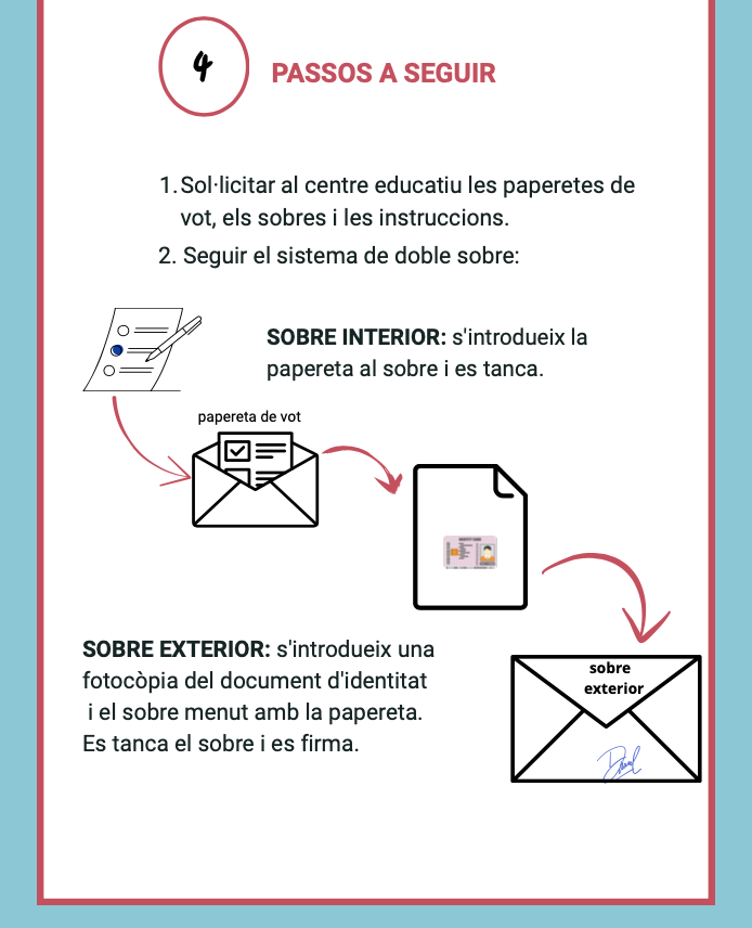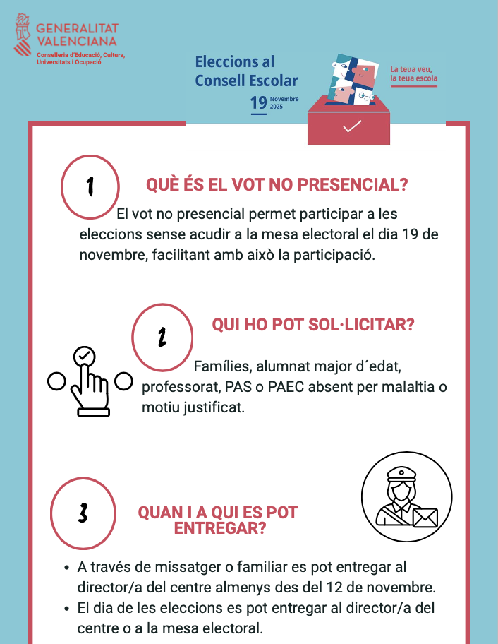 A partir d’avui s’inicia el procediment de vot no presencial, que permet participar en les eleccions sense acudir a la mesa electoral el dia 19 de novembre, facilitant així la participació de totes les famílies.