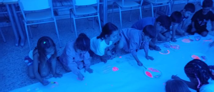 El día 10 de Junio, los alumnos/as de Infantil de 3, 4 y 5 años realizaron un gran mural con pinturas fluorescentes y luz negra. Decoraron con pinceles y papel blanco reciclado.