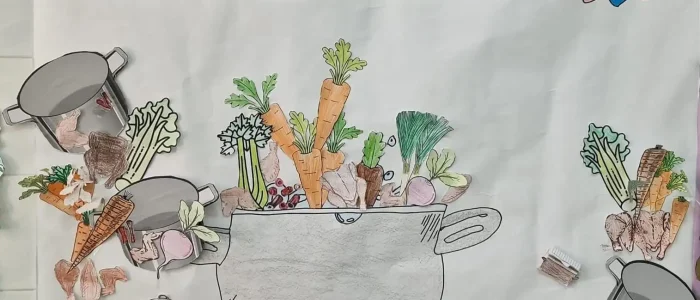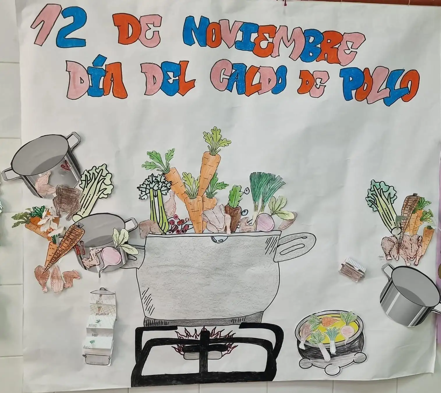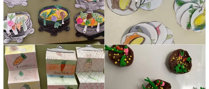 El mes de novembre treballem els ingredients del caldo de pollastre com el fa la nostra cuinera.Vam fer manualitats per a conéixer els aliments i una gymnkana on calia reunir els ingredients per a poder elaborar este riquíssim caldo. Vam donar la benvinguda a la tardor,utilitzant les fulles caidas dels arbres,animals, fongs…tot relacionat amb l’estació de l’any