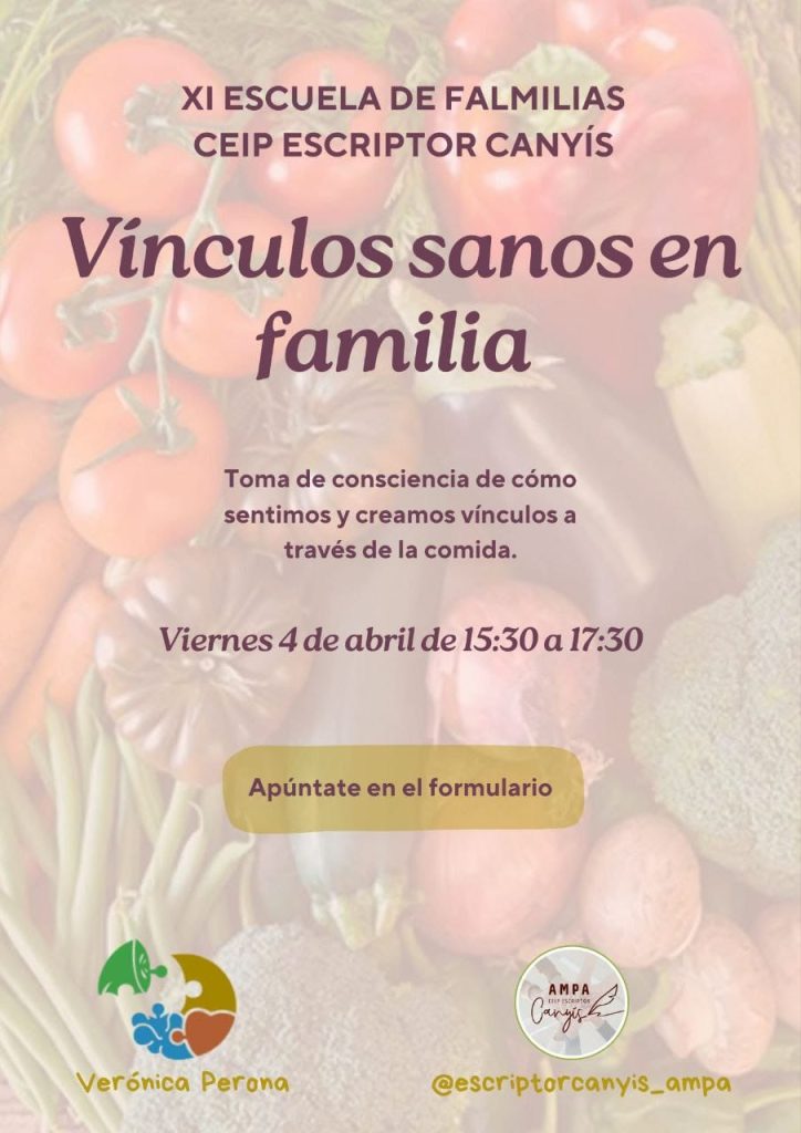 Os invitamos a la XI Escuela de Familias del CEIP Escriptor Canyis a cargo de la Asociación Verónica Perona, psicóloga infanto-juvenil. Formada en enuropsicología, cuentoterapia, gestalt, crianza y alimentación consciente.