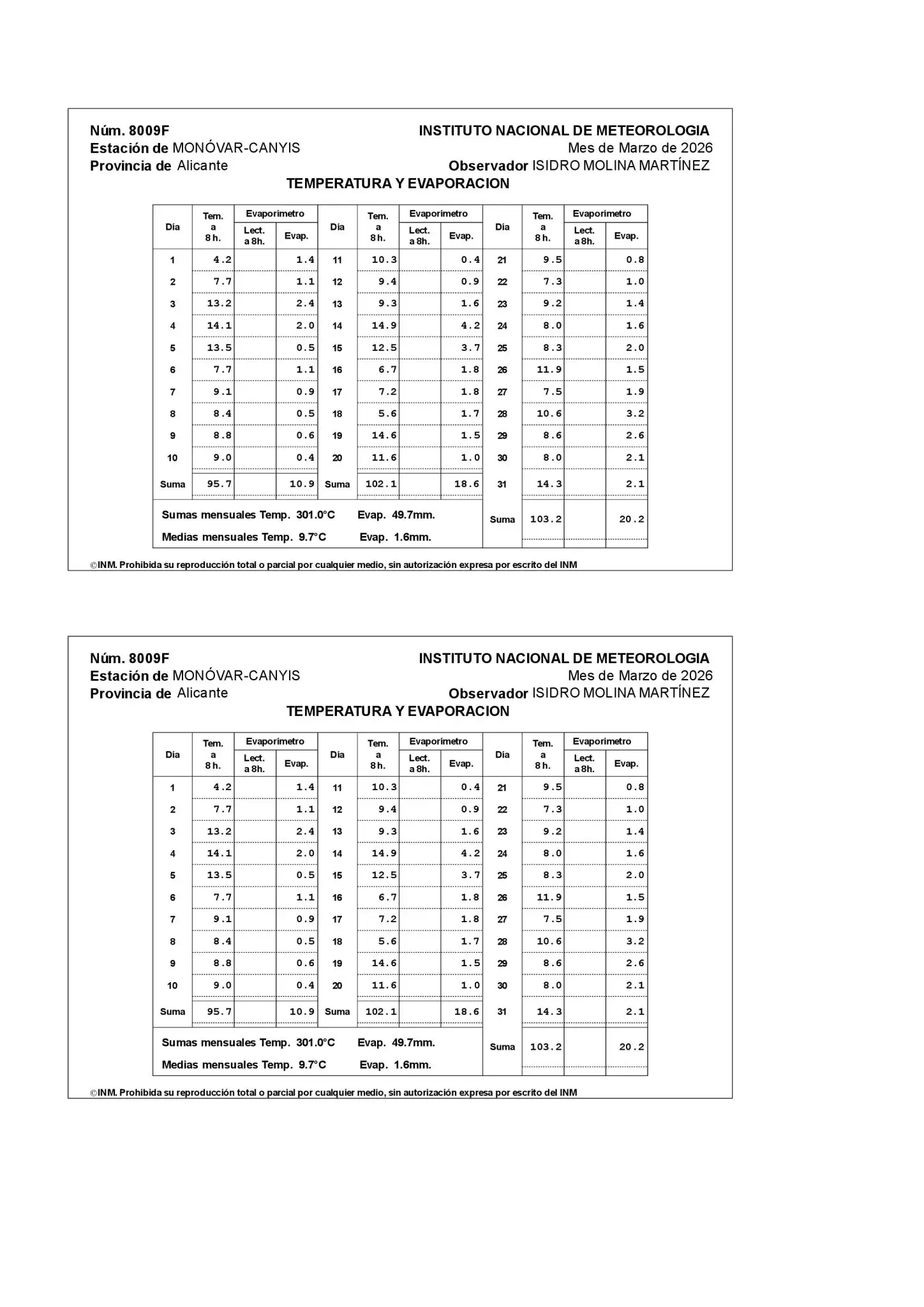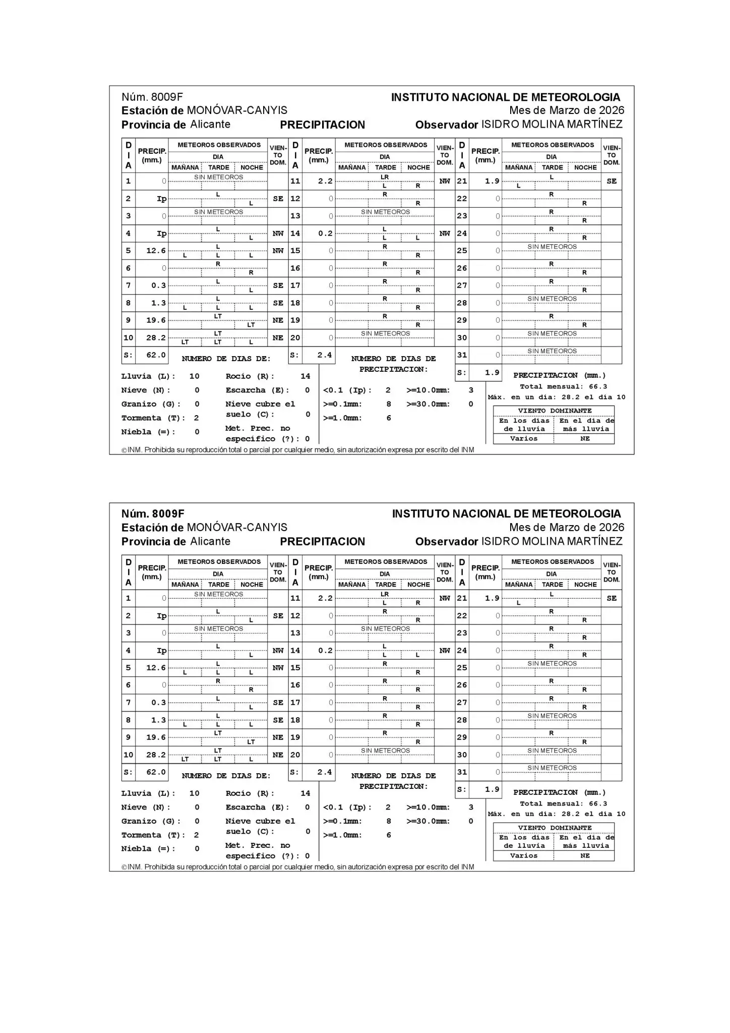 Fuera del trimestre invernal, en marzo se han producido dos temporales que han dejado lluvias generalizadas. El primero de ellos se produjo los días 5 y 6 y el segundo el día 10 y afectó sobre todo a Alicante, especialmente a la zona de Elche.