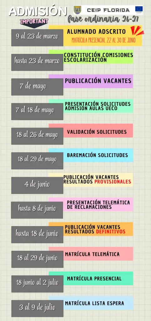 Calendario de la FASE ORDINARIA del proceso de admisión