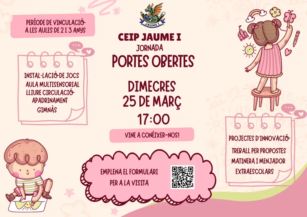 El proper dimecres 25 de març realitzarem la nostra jornada de portes obertes perquè les famílies que volen matricular als seus fills i filles tinguen l’oportunitat de conéixer el nostre centre. Completeu el formulari d’inscripció abans del 22 de març. Vos esperem!
