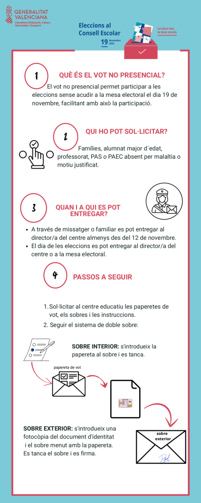 Les persones que vulguen votar de manera no presencial amb el sistema del doble vot, poden passar pel centre a recollir la papereta i els sobres per a les votacions.