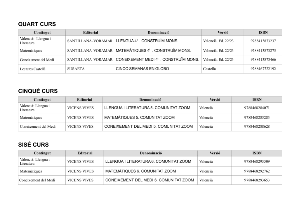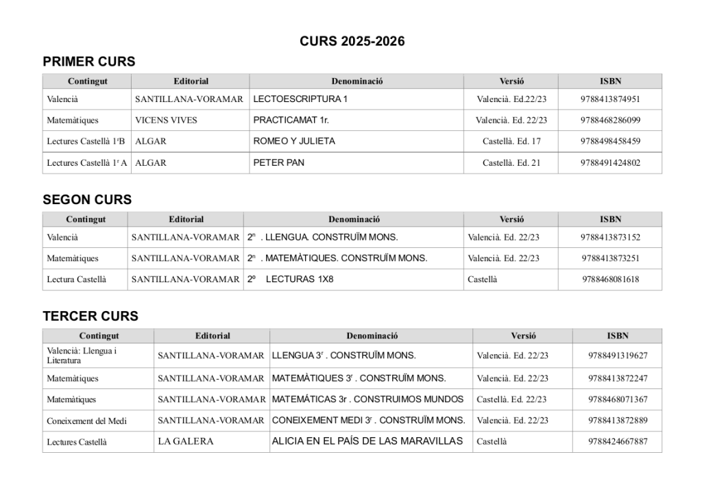 Aquest és el llistat de llibres de text per al curs 2025-2026, si voleu descarregar-vos-el cliqueu el botó blau. També podeu trobar el llistat de materials pers cursos clicant en cadascun dels botons corresponents.