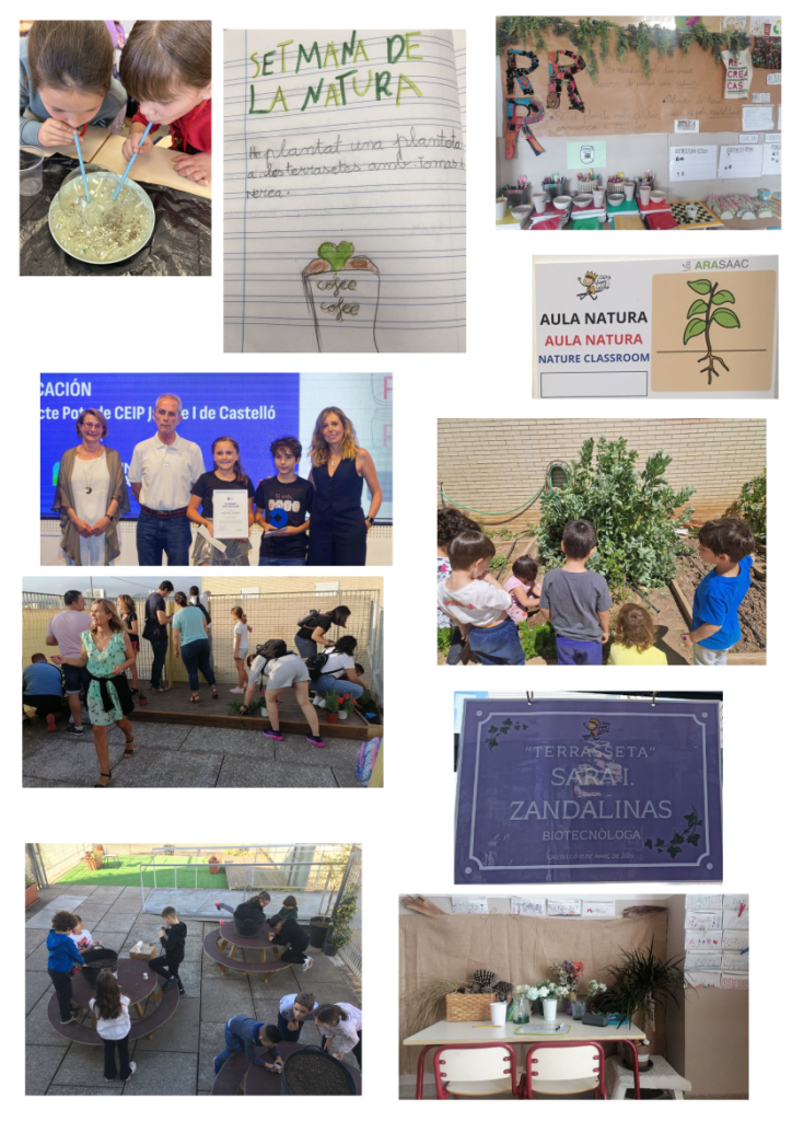 –TRANSFORMACIÓ DE DIFERENTS ESPAIS: hem transformat aules natura interiors i un aula natura exterior. L’aula natura exterior ha rebut el nom d’una Biotecnòloga anomenada Sara Izquierdo Zandalinas que treballa en la Universitat Jaume I. El nom va ser elegit en assemblea de delegats i delegades i Sara va poder vindre a la inauguració oficial d’aquest espai. També està previst que vinga el proper curs a la nostra escola.