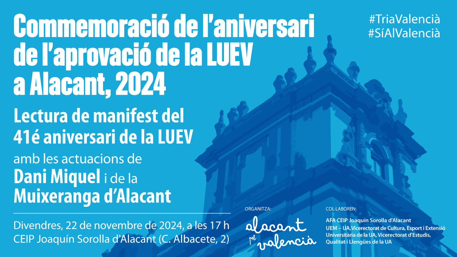Llegir més: Commemoració de l’aniversari de l’aprovació de la LUEV 2024El próxim divendres 22 de novembre de 2024 a les 17.00h es celebrarà una jornada en commemoració per l’aniversari de l’aprovació de la Llei d’Ús i Ensenyament en Valencià al nostre centre. Us animem a participar! Programa OrganitzaAlacant pel Valencià Col·laboraAFA CEIP Joaquín Sorolla d’AlacantUEM – UAVicerectorat de Cultura, Esports i Extensió Universitària de la…