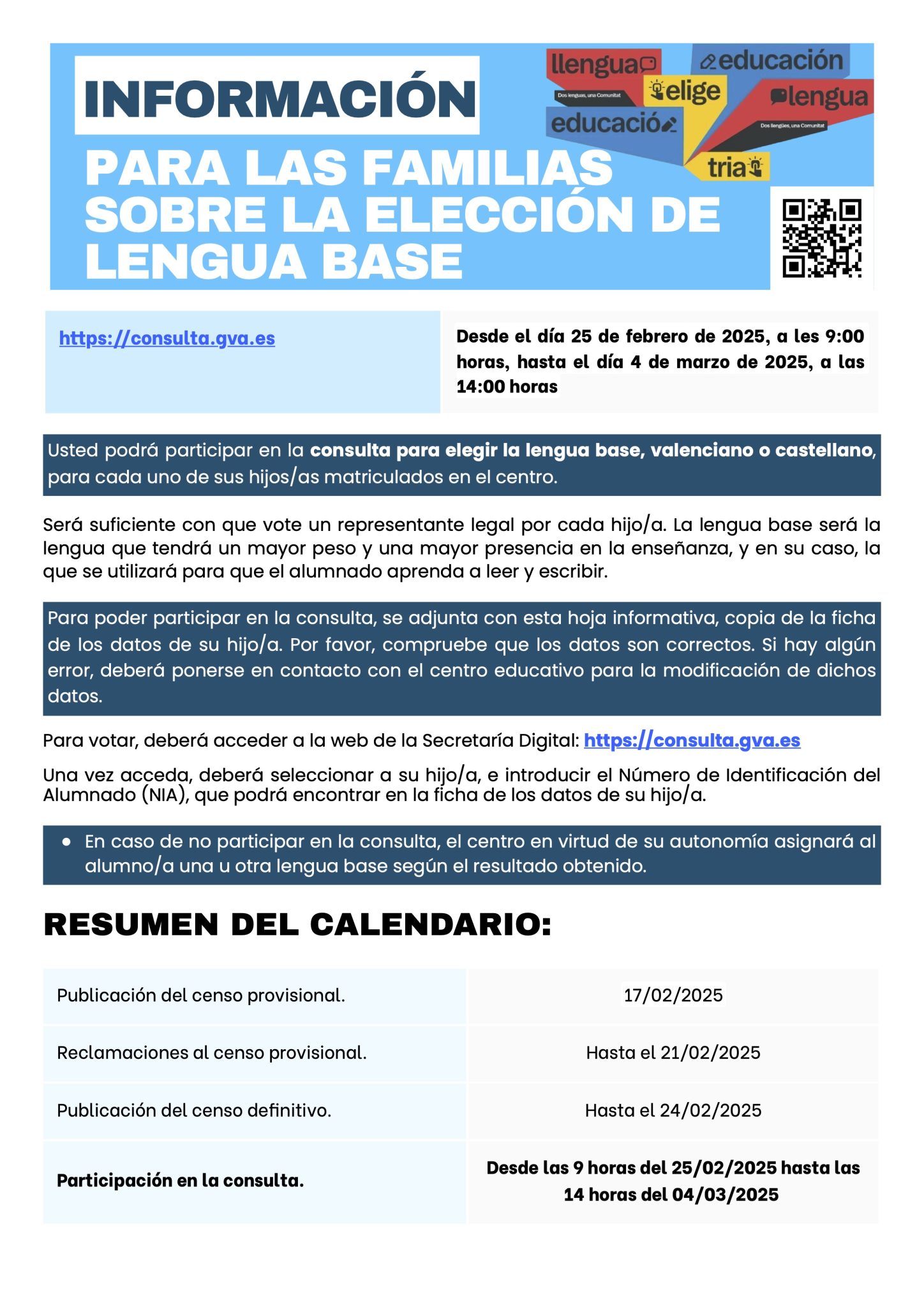 INFORMACIÓN PARA LAS FAMILIAS SOBRE LA ELECCIÓN DE LA LENGUA BASE