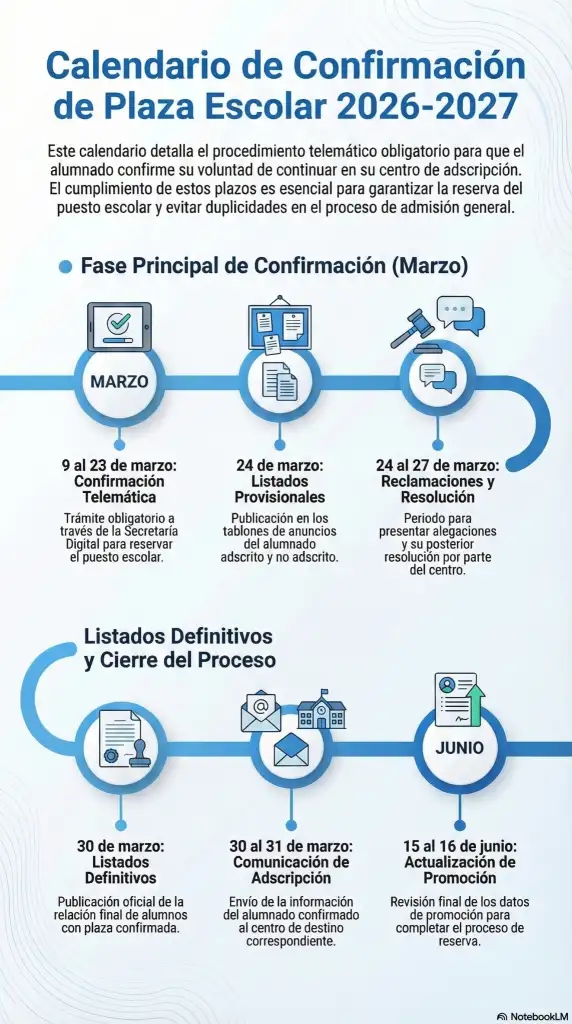- Del 30 al 31 de marzo de 2026: Los centros comunican al centro de adscripción la información del alumnado que ha confirmado plaza.