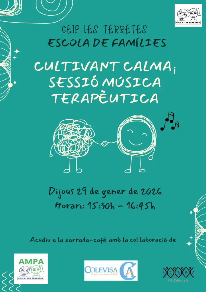 La primera sessió tindrà lloc el pròxim dijous 29 de gener a les 15:30 hores i portarà per títol: “Cultivant calma: sessió de musicoteràpia”. Aquesta activitat té com a objectiu promoure el benestar mental, físic i emocional de les famílies a través d’una experiència de relaxació i connexió personal.