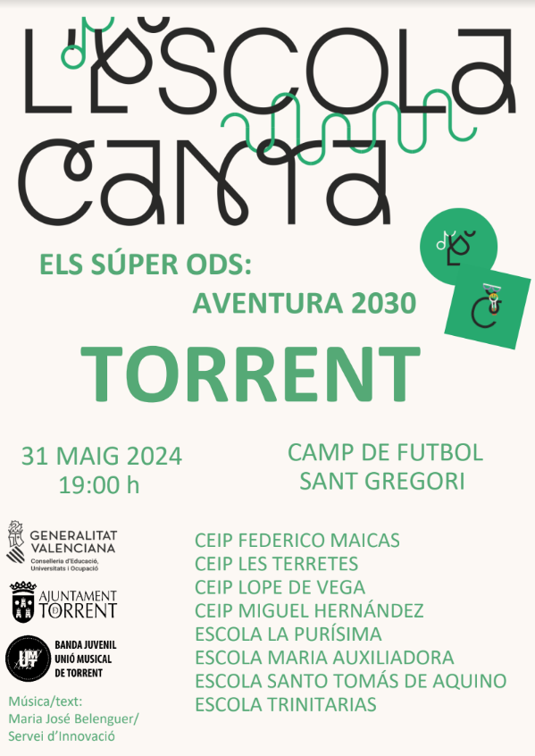 AVENTURA 2030, y es obra de la compositora MaJosé Belenguer y letra del Servei d’Innovació. En la citada composición se han trabajado letras y contenidos relacionados con los Objetivos de Desarrollo Sostenibles de la Agenda 2030 como el cuidado de la naturaleza, la igualdad de género o la reducción de la contaminación global del planeta. La cantata está integrada por 7 canciones y un pequeño texto teatral, explica la historia de 5 superhéroes que vienen a nuestro planeta a ayudarnos a mejorar la situación que vivimos en la actualidad para alcanzar los objetivos de la Agenda 2030.
