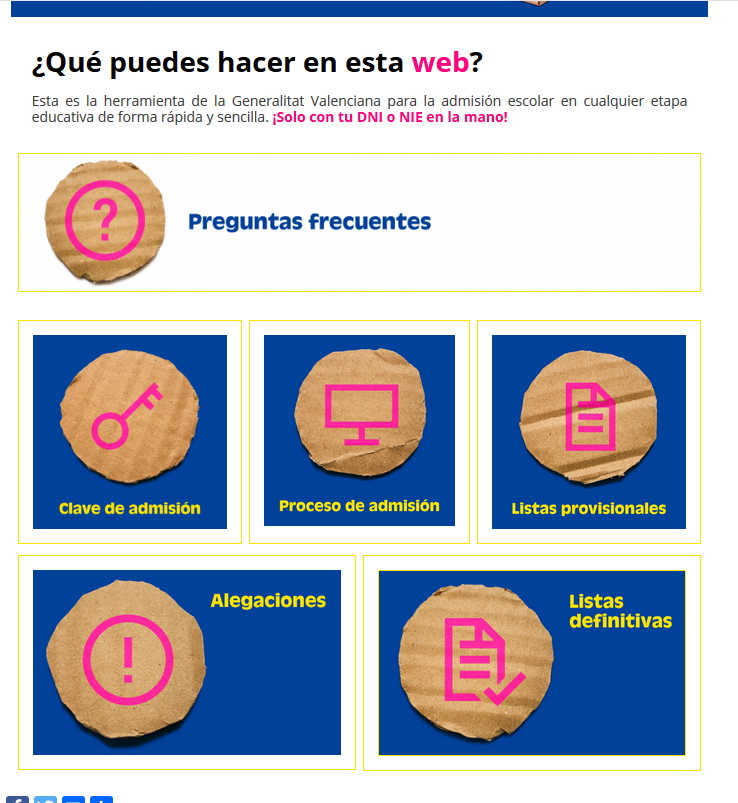 2n Per a realitzar la sol·licitud telemàtica quan es tinga la clau d’admissió.![]() | Les persones que no tenen DNI/NIE o les que no tenen accés a mitjans electrònics podran fer el procediment d’admissió de manera presencial en els centres educatius on vulguen sol·licitar plaça com a primera opció en les mateixes dates en què està determinat el procediment telemàtic. |