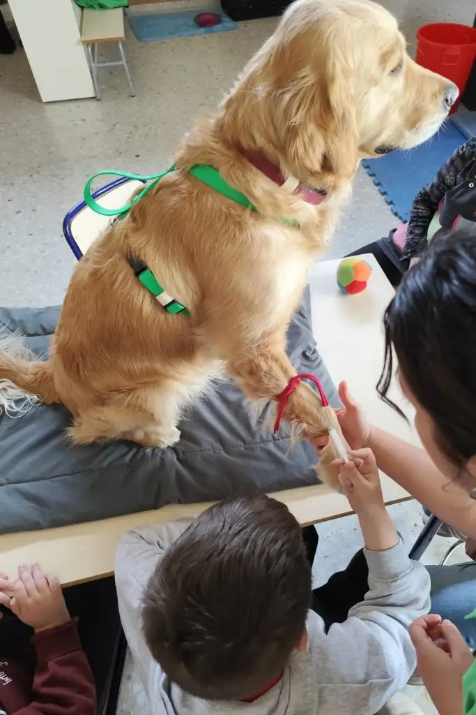 En cada sessió comptem amb la participació de Lucca, el gos d’intervenció, i de Mª Jesús, terapeuta ocupacional experta en Teràpia Assistida amb Gossos i amb àmplia formació en infància i Integració Sensorial.
