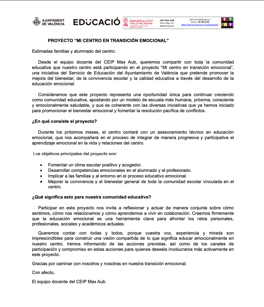 Desde el cole, queremos seguir impulsando iniciativas que favorezcan el bienestar emocional de la comunidad educativa, y especialmente de nuestro alumnado. Por este motivo, nos hemos adherido al proyecto «Mi centro en transición emocional» promovido por el Ayuntamiento de València. Toda la información en el siguiente documento: