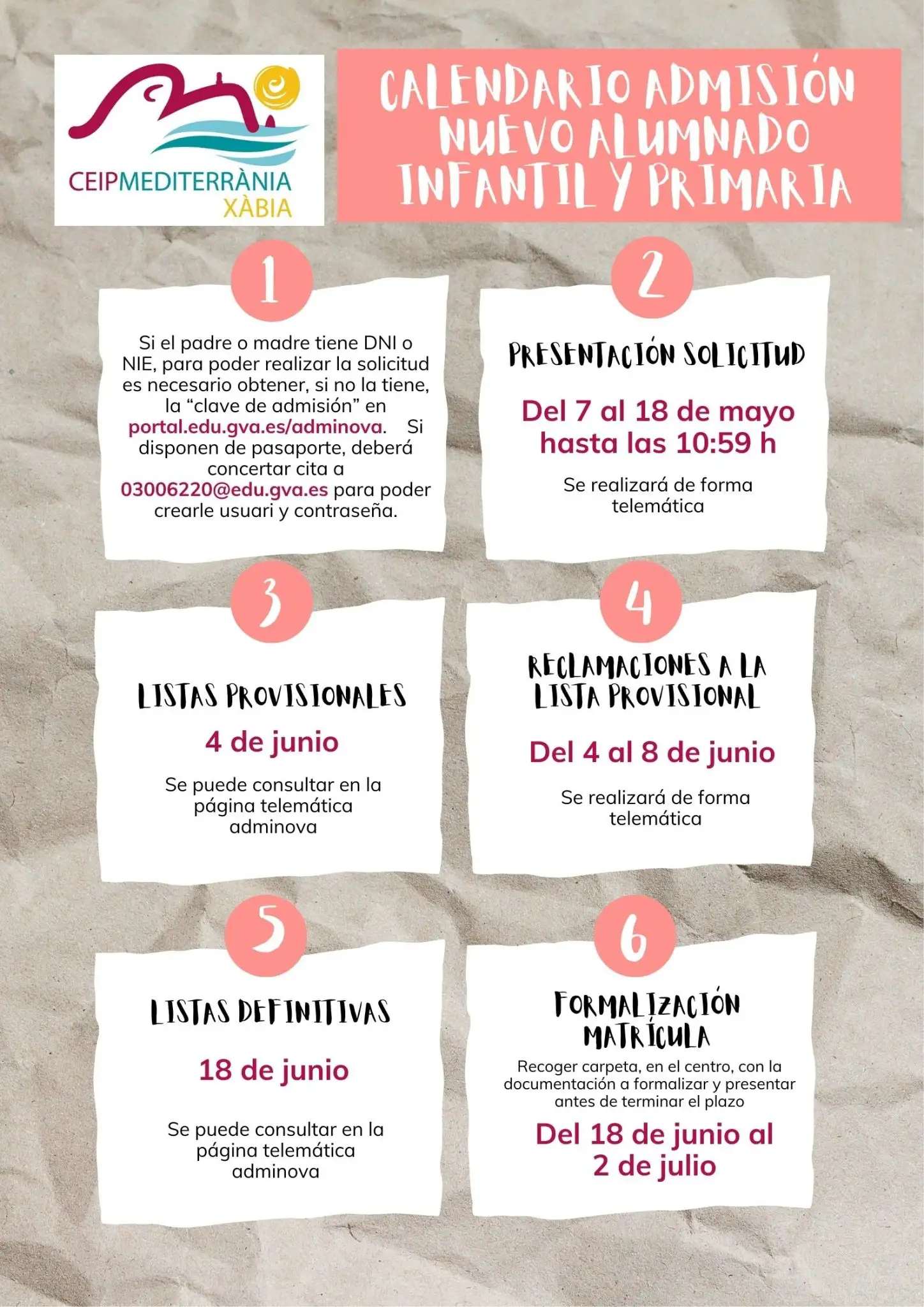 Las solicitudes se tramitarán de manera electrónica en https://portal.edu.gva.es/adminova/ con el DNI, NIE o certificado de registro de ciudadanía de la Unión Europea. Si el padre/madre o tutor/a dispone de pasaporte o un documento diferente de NIE, puede pedir cita previa para la tramitación de la matrícula en el centro de primera opción.