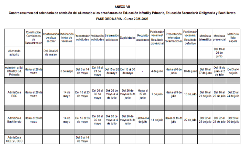 Resolución de 12 de marzo de 2025 por la que se establece el calendario y se dictan instrucciones de admisión 2025-2026