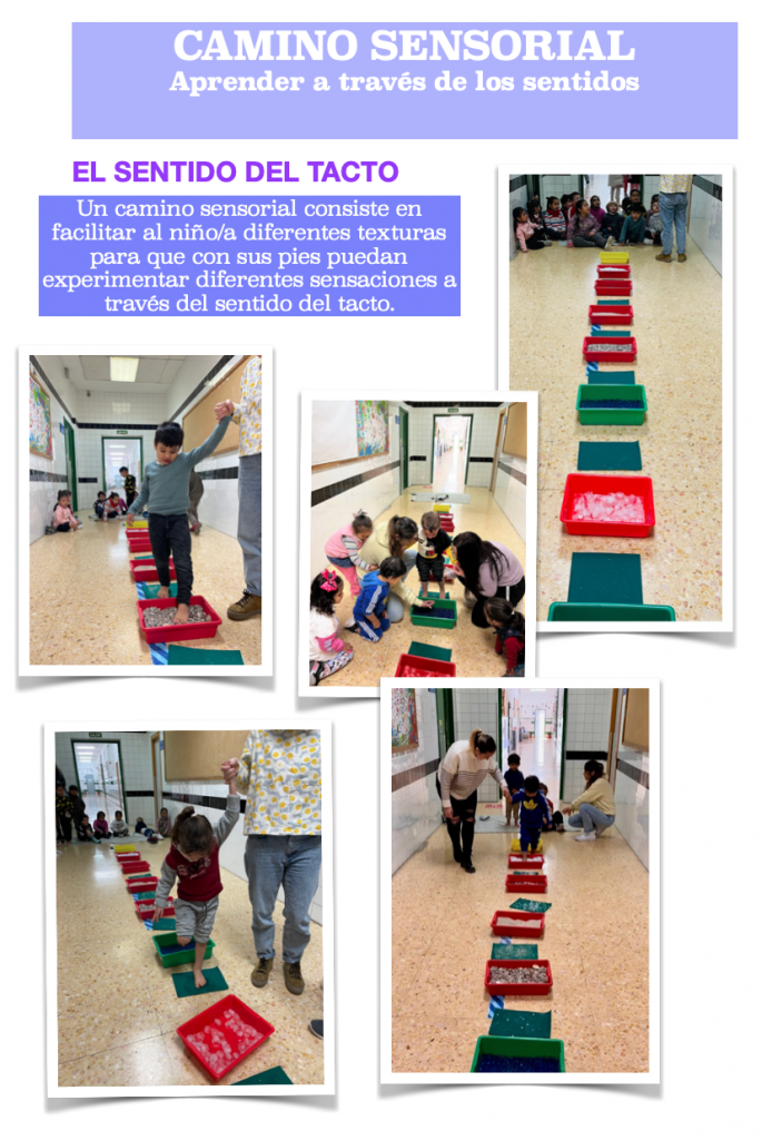 Los niños y niñas de 3 y 4 años hemos jugado con el sentido del tacto a través de este divertido camino sensorial. Con nuestros pies hemos sentido muchas sensaciones interesantes: la suavidad de la arena, la viscosidad de las bolas de hidrogel, la aspereza de los estropajos, el frio del hielo o el calor del agua. Nos lo hemos pasado genial…