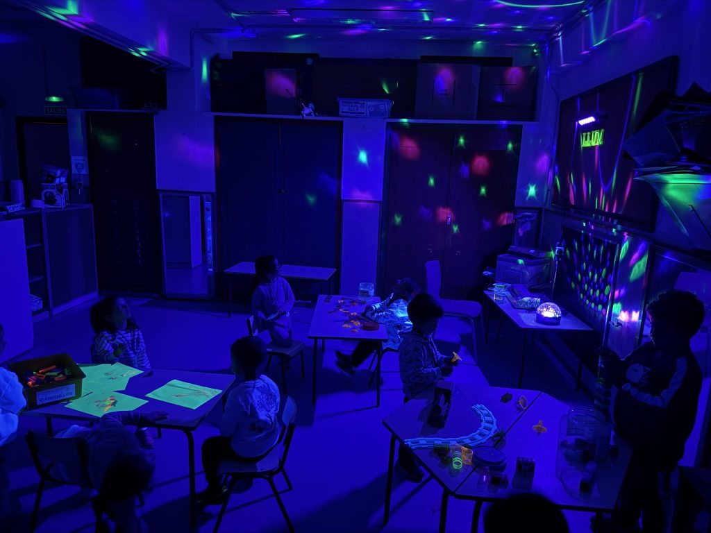 Tenemos luz negra, juego simbólico ( veterinario, mecánico y mercado) y construcciones.