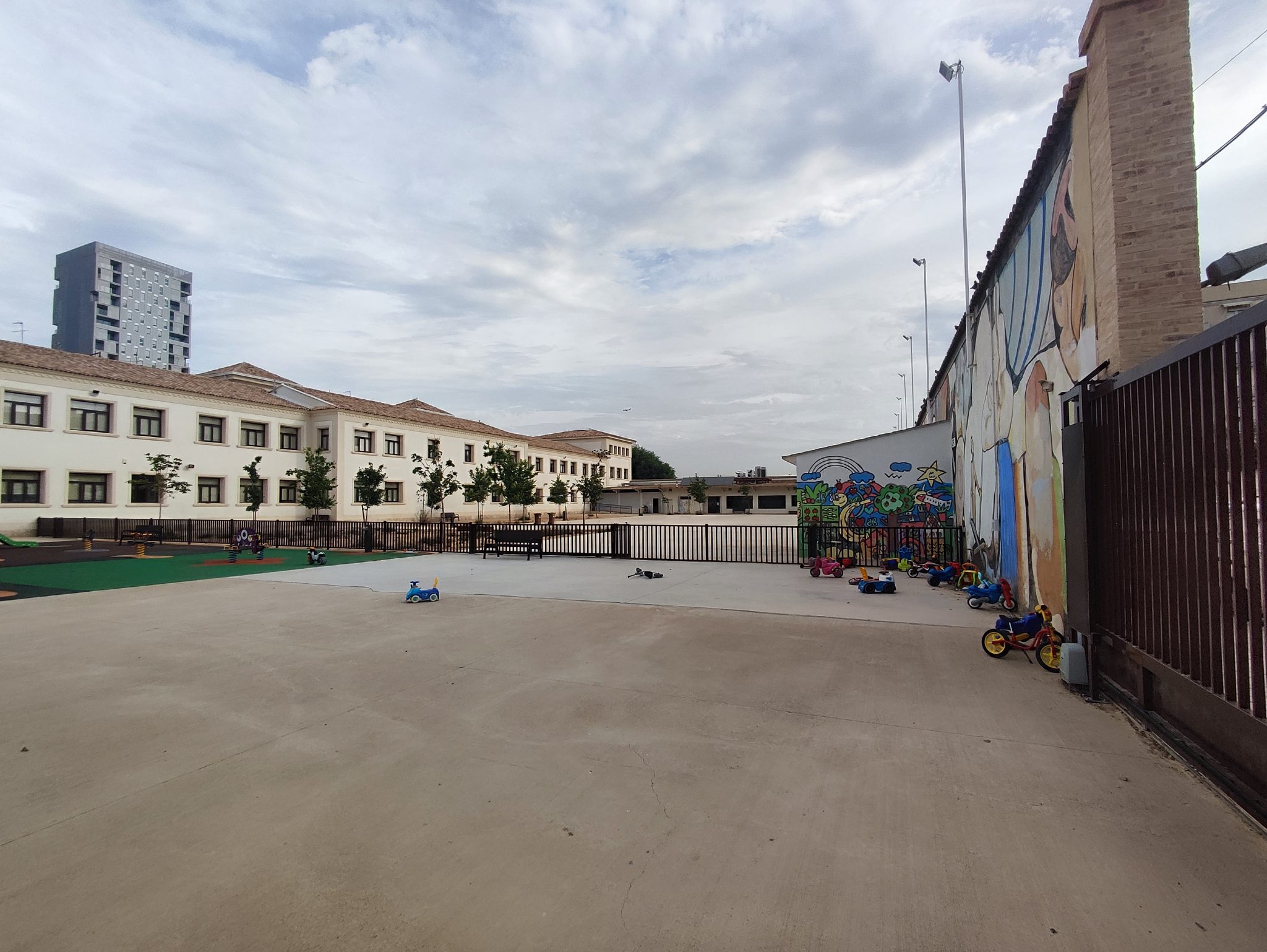 En el colegio tenemos un patio específico para la etapa de Educación Infantil que consta de dos partes, una con tobogán, caseta y juegos de equilibrio con un suelo blando y la otra con un suelo de asfalto y también con forma rectangular donde el alumnado puede correr y conducir bicicletas, patines, triciclos…