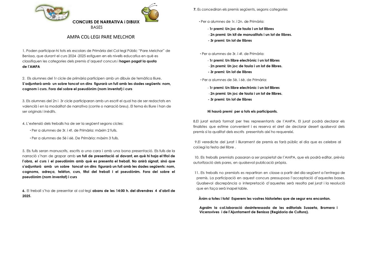 L’AMPA ha organitzat el concurs de narrativa i dibuix per a l’alumnat de primària, sent per al concurs de dibuix per a primer i segon, i el concurs de narrativa per a tercer, quart, cinqué i sisé de primària. Les bases també estan enviades al correu electrònic.