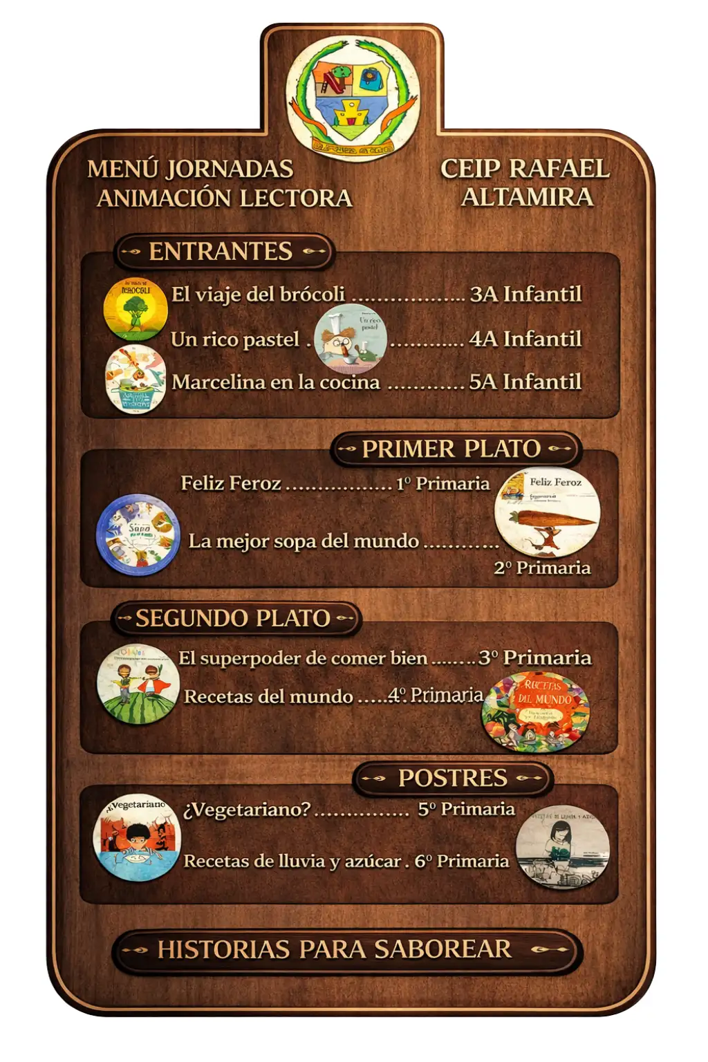 Cada nivel educativo ha elegido un libro muy especial, formando entre todos un auténtico menú literario que podréis descubrir a continuación, donde cada historia es un plato lleno de imaginación, emociones y aprendizaje.