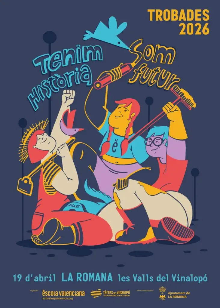 Les Trobades d’Escoles en Valencià tornen enguany sota el lema “Tenim història, som futur”, una expressió que posa el focus en el futur que volem construir entre totes i tots. En aquesta edició, una de les cites més especials serà la que tindrà lloc a La Romana el 19 d’abril, una jornada molt esperada per tota la comunitat educativa de les comarques del sud. Les Trobades són una festa que uneix escoles, famílies, mestres i entitats en una celebració viva de cultura, identitat i convivència. Des del seu naixement, han esdevingut espais imprescindibles on el valencià es viu amb naturalitat, reivindicació i alegria, amb cercaviles, tallers, actuacions musicals, danses i activitats per a tots els públics, convertint-se així en un referent anual que pot arribar a reunir desenes de milers de participants arreu del territori. La jornada de La Romana mantindrà aquest esperit festiu i participatiu, amb tallers elaborats pels centres educatius, paradetes d’entitats compromeses amb la llengua, música, espectacles i un ambient comunitari que farà del 19 d’abril una data inoblidable. Les Trobades d’enguany també compten amb una imatge gràfica molt representativa, creada per la dissenyadora Vane Julián, amb la cançó oficial “Xiulaballariu”, del grup Canta Canalla, que aporta ritme i energia a la celebració.