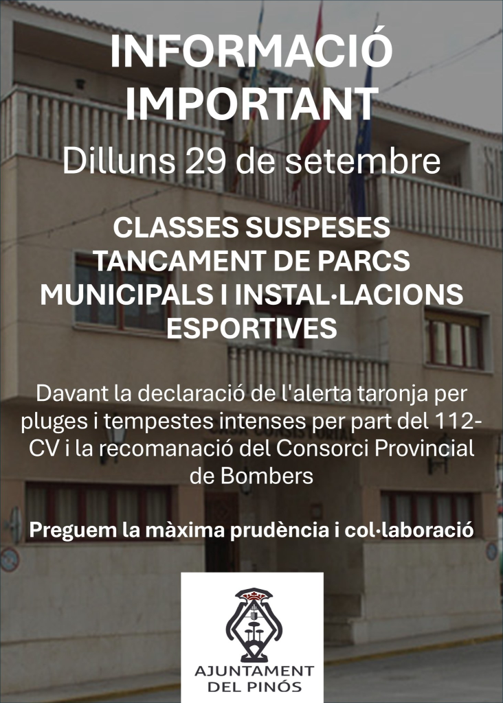 per part del 112-CV i la recomanació del Consorci Provincial de Bombers d’evitar tota mobilitat innecessària, l’Ajuntament del Pinós ha decidit prendre les mesures preventives següents per al dilluns 29 de setembre: