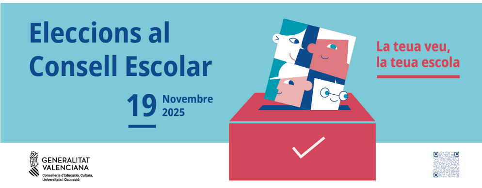 Según la Resolución de 30 de setiembre del año 2025, de la Conselleria de Educació, Cultura, Universitats i Ocupació (DOGV 10208, de 03/10/2025), se convocan elecciones a Consejos Escolares en los centros docentes públicos no universitarios de la Comunidad Valenciana para la renovación de la segunda mitad del Consejo Escolar de nuestro Centro.
