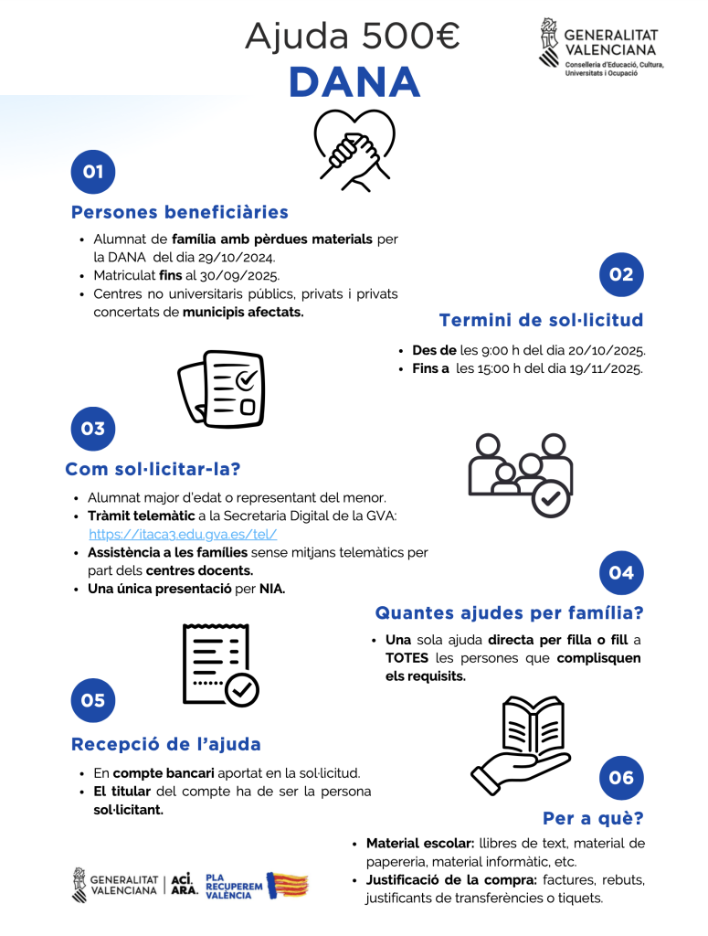 Tal i com ja vos hem informat mitjançant l’Agenda d’ITACA Família, al DOGV s’ha publicat aquest matí el Decret 148/2025 on s’aprova la concessió d’ajudes directes per la compra de material escolar a l’alumnat de les localitats afectades per la DANA del passat 29 de novembre.
