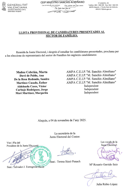 Publicada l’acta de proclamació de les candidatures electes a la renovació de la segona meitat del Consell Escolar del CEIP Maestro Sanchis Almiñano