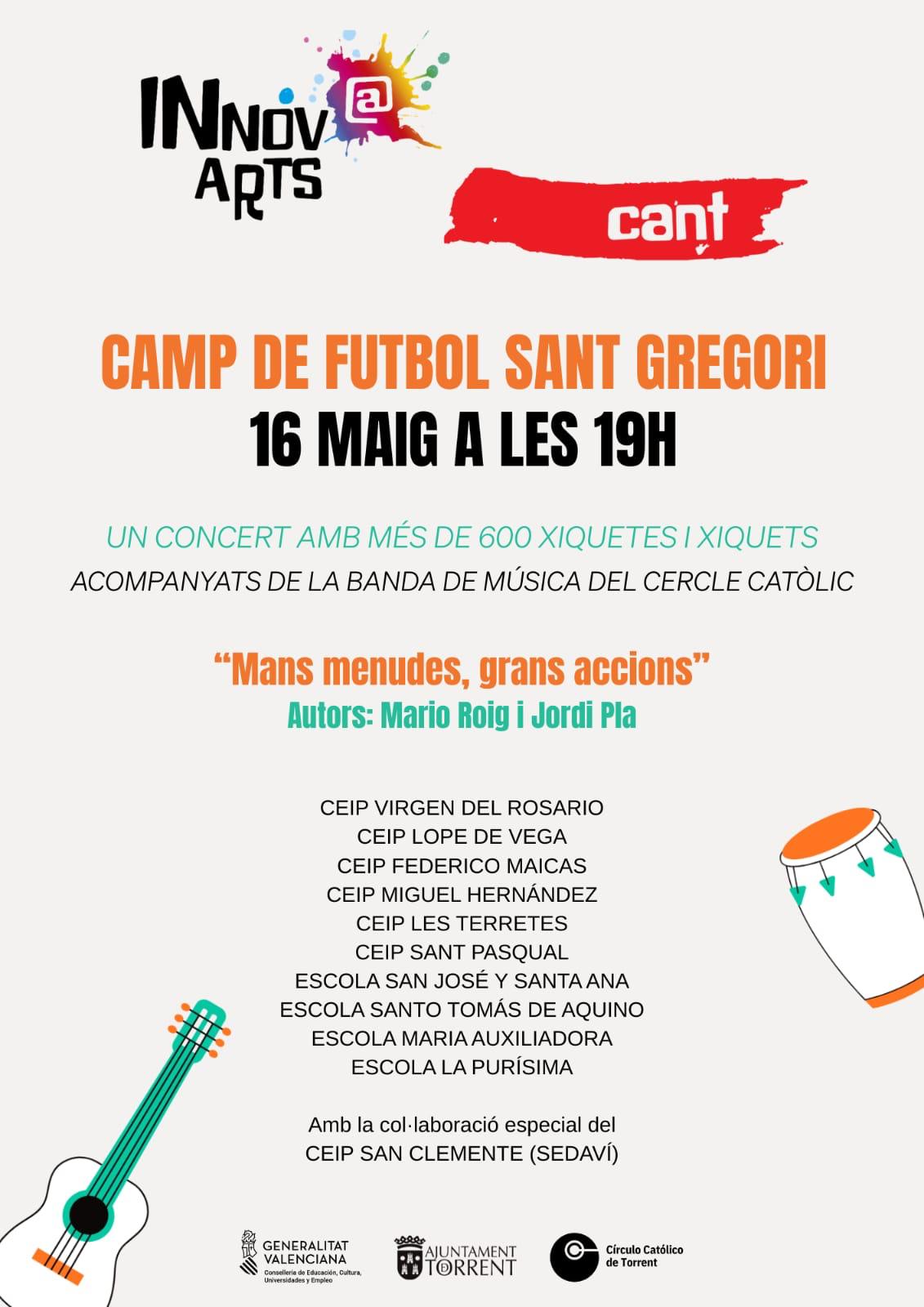 El Projecte “INNOV@ARTS” forma part d’ESCOL@RTS , que desenvolupa la Conselleria d’Educació. Este curs s’ha interpretat la cantata “Mans menudes, grans accions“. L’actuació s’ha desenvolupat el dia 16 de maig de 2025 en el camp de futbol de Sant Gregori de Torrent després de mesos d’assajos. En el projecte han participat les escoles de Torrent i el nostre centre educatiu, CEIP San Clemente, amb al voltant de 600 alumnes. Ens ha acompanyat la Banda de Música “Cercle Catòlic”.