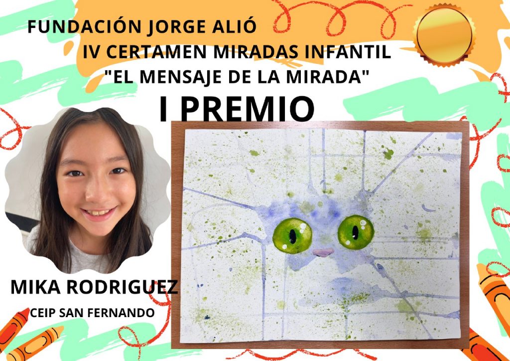Nuestra alumna Mika Rodriguez de 6º de primaria ha obtenido el primer premio en el IV Certamen «Miradas infantil» con el lema “El mensaje de la mirada”, dirigido a todos los niños y niñas de la ciudad de Alicante, incluidos los niños con discapacidad visual.