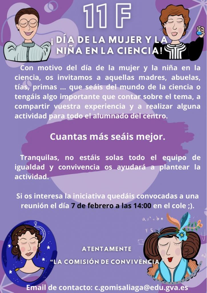 El próximo 11 de febrero se celebra el día de la mujer y la niña en la ciencia y queremos contar con la colaboración de la familias para celebrarlo. Os invitamos a la reunión informativa que se llevará a cabo el día 7 a las 14h.