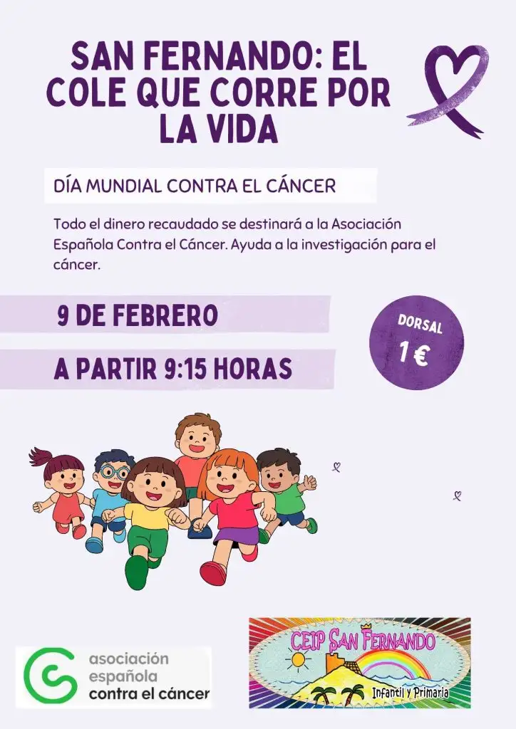 El día 9 de febrero la Asociación española contra el cáncer ha organizado una carrera solidaria a nivel nacional, la “CARRERA ESCOLAR CONTRA EL CÁNCER 2026”. Nuestro centro no podía hacer oídos sordos a esta propuesta y, por supuesto, nuestro profesorado de Educación física va a organizar una para nuestro alumnado. Todo el dinero recaudado se destinará a la Asociación Española Contra el Cáncer para la investigación contra el cáncer.
