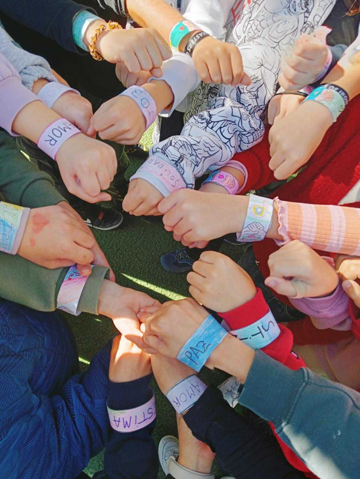 – Cada alumne va escriure un bonic missatge relacionat amb la pau i la no-violència en una polsera de paper i ens les posarem. lluint-les boniques i úniques.