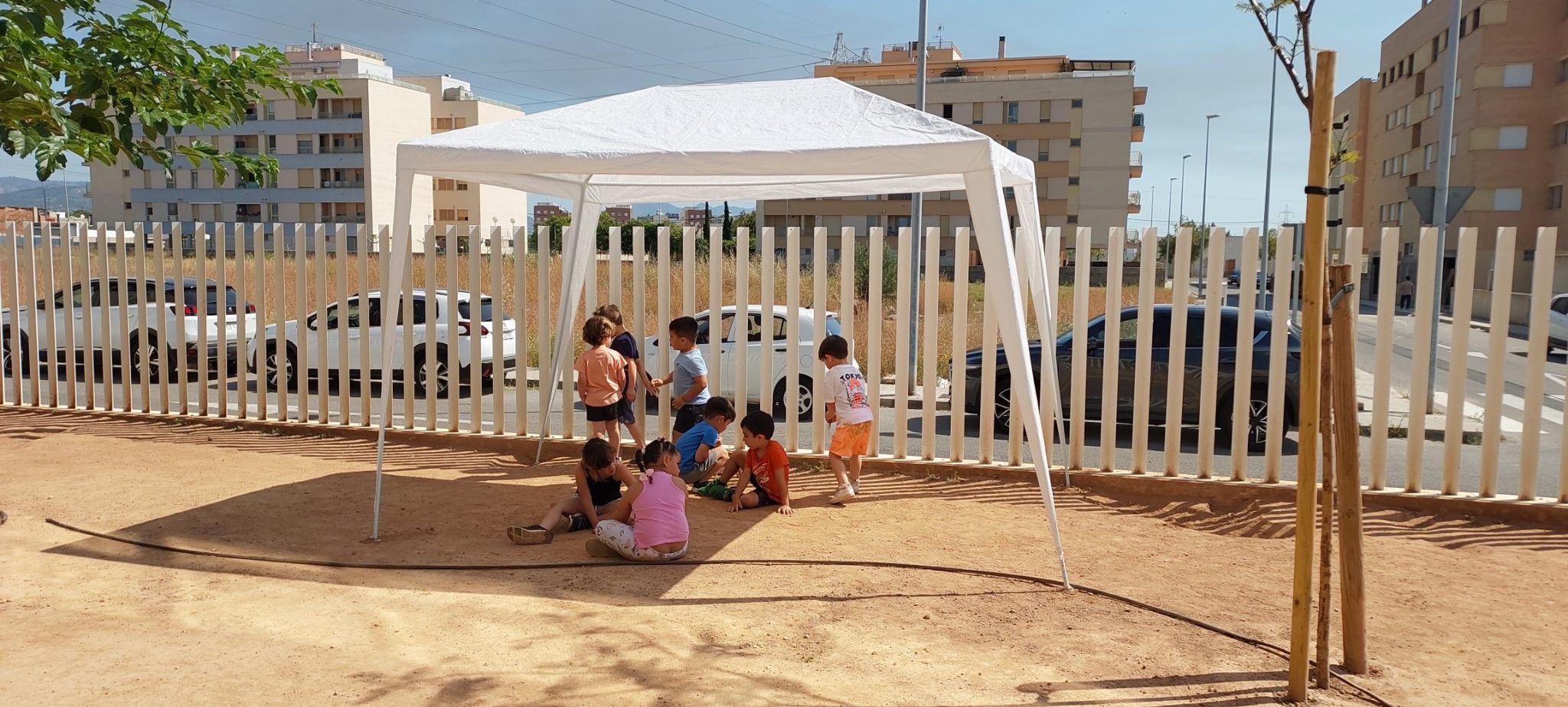 Hemos creado un espacio flexible en el patio que nos permite buscar la sombra en los días de más calor. Solo por el hecho de incorporar un espacio nuevo, los niños y niñas se sienten resguardados y les encanta venir a jugar aquí debajo.
